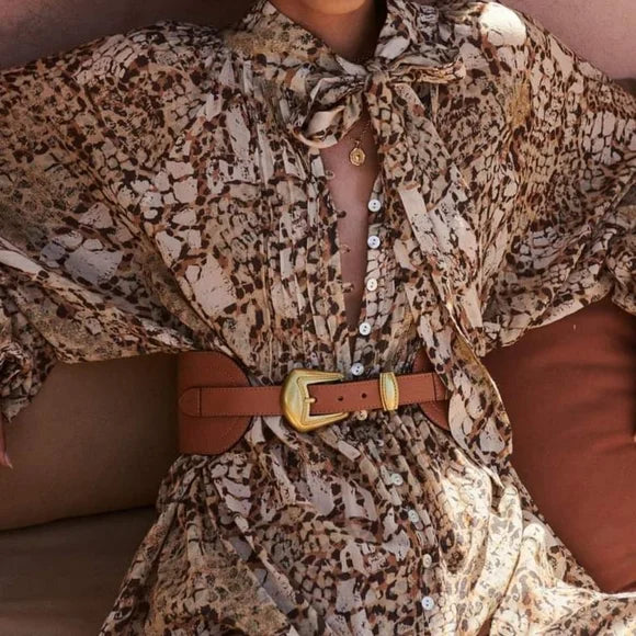“ Our Vista Belt is the perfect styling accessory for any occasion. In a gorgeous rich tan colourway that goes with everything, this belt is comfortable and flattering and is designed to wave over the curves of the waist. Adorned with an antique gold finished buckle, tip and keeper, this corset style is an instant elevation to any outfit. Wear it with any Spell boho, gown or mini dress to cinch the waist or make a statement wearing this one with a classic white shirt and denim with some cute tan mules. Team our gorgeous belt with the Vista Bag to complete any outfit with perfection.”